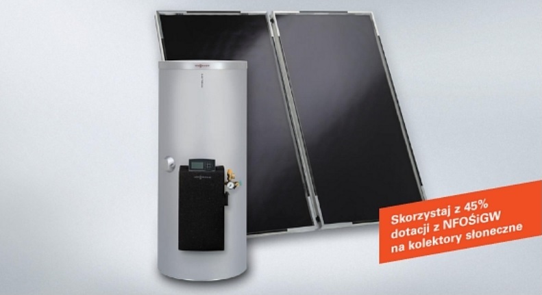 Pakiet do podgrzewu c.w.u. składa się z dwóch płaskich kolektorów słonecznych Vitosol 200-F (Typ SVK) i biwalentnego pojemnościowego podgrzewacza c.w.u. Vitocell 100-B o pojemności 250 litrów.
